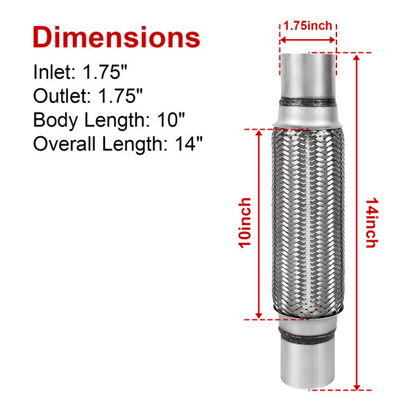 PRODUCT SIZE: 1.75″ Inlet/outlet diameter,10’’ Body length,14″ Overall length,1 Piece of 100% brand new double braided flex pipe.
