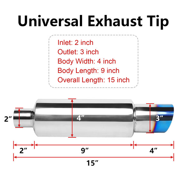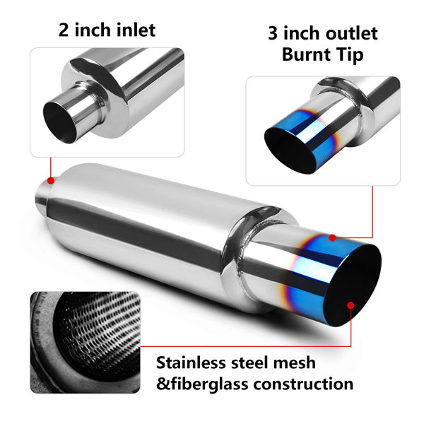 Exhaust Muffler,Stainless Steel Exhaust Burnt Tip,14.7”Length for Universal Fitment on Most Cars, Sedans, and Trucks,Burnt Blue(2” Inlet 3” Outlet)