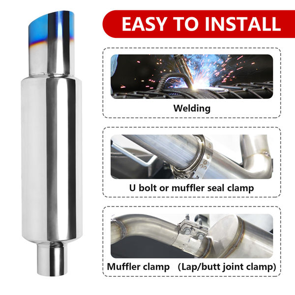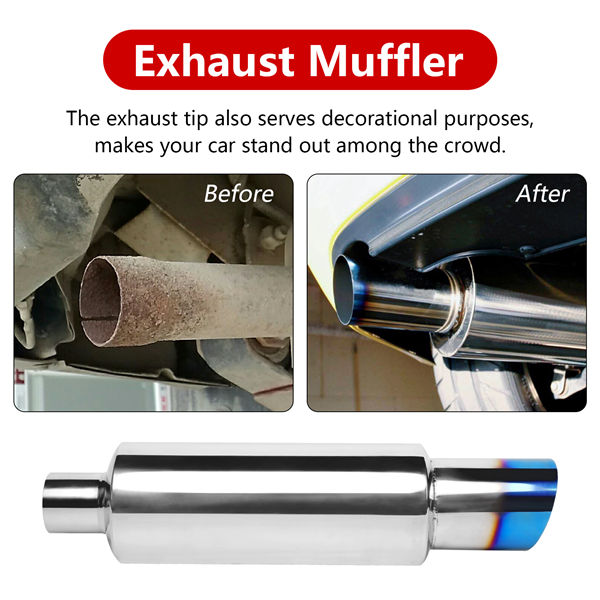 FUNCTION – Straight-through muffler is densely packed with excellent, sound-absorbing cotton producing a low, deep tone while absorbing sound waves, and resonated muffler improves exhaust velocity performance.The exhaust tip can not only relieves back pressure to prevent the deformation of the car exhaust pipe, but also play the role of supercharging and turbulence.