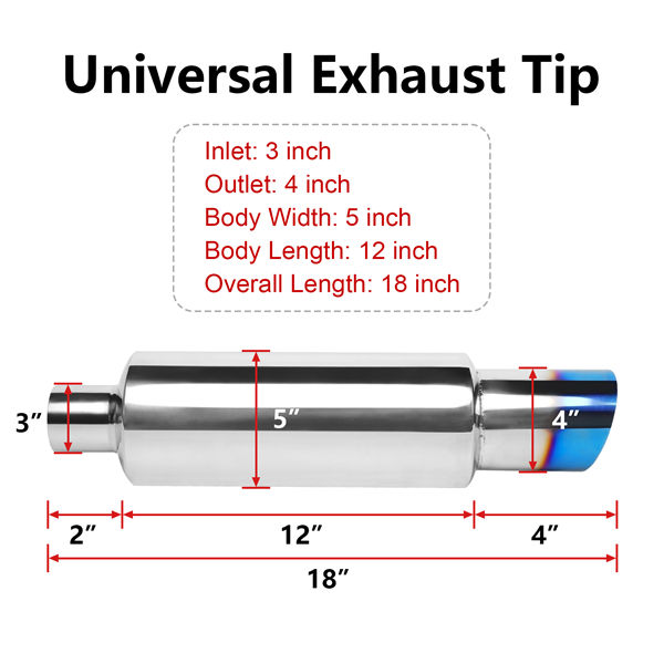 Exhaust Muffler,Stainless Steel Exhaust Burnt Tip,18”Length for Universal Fitment on Most Cars, Sedans, and Trucks,Burnt Blue(3” Inlet 4” Outlet)