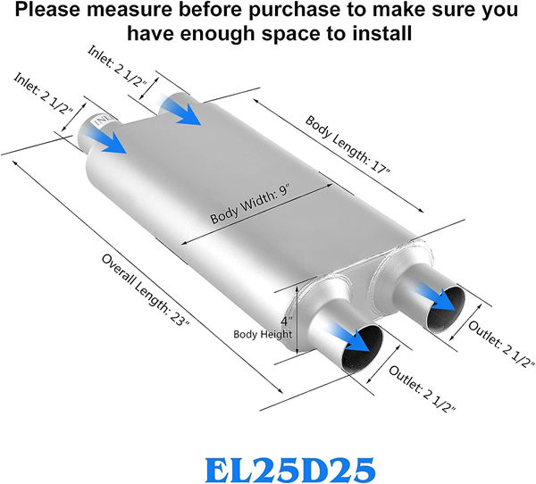 Adaptability-This dual in dual out muffler universal 2.5 inch muffler is fit on most vehicles, 3 chamber muffler only requires clamps or welding for installation.