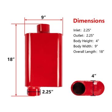 Muffler size–2.25”inlet 2.25”outlet| Body Length: 13″| Overall Length: 18″| Body Height: 4″ | Body Width: 9.5″ |