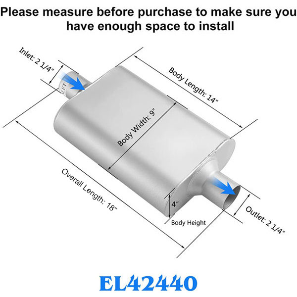 Muffler size–2.25”inlet 2.25”outlet| Body Length: 13″| Overall Length: 18″| Body Height: 4″ | Body Width: 9.5″ |