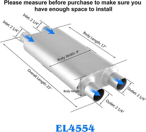 Adaptability-This dual in dual out muffler universal 2.25 inch muffler is fit on most vehicles, 3 chamber muffler only requires clamps or welding for installation.
