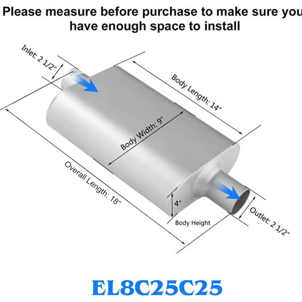 Muffler size–2.5”inlet 2.5”outlet| Body Length: 13″| Overall Length: 18″| Body Height: 4″ | Body Width: 9.5″ |