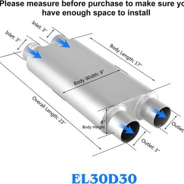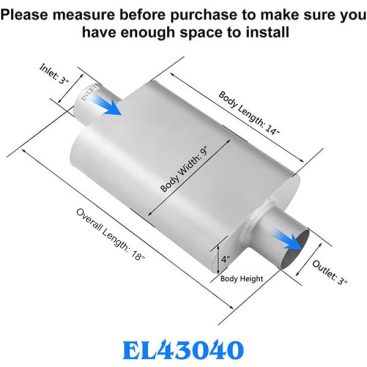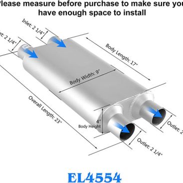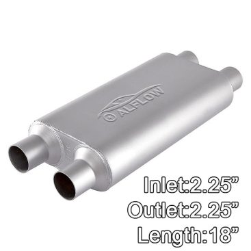 Muffler size–2.5”inlet 2.5”outlet| Body Length: 13″| Overall Length: 18″| Body Height: 4″ | Body Width: 9.5″ |