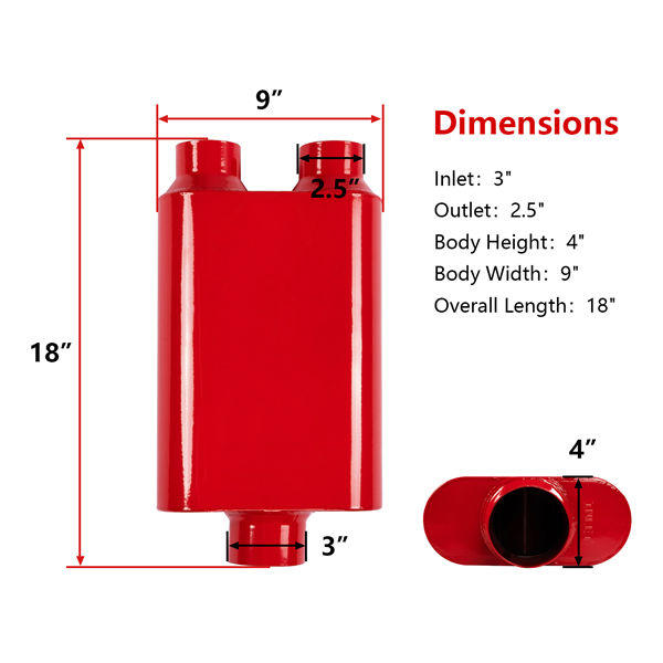 Muffler size–3”inlet 2.5”outlet| Body Length: 13″| Overall Length: 18″| Body Height: 4″ | Body Width: 9.5″ |